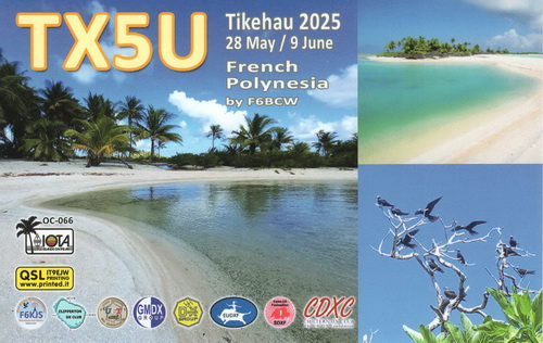 TX5U | Tikehau Atoll, Fr. Polynesia by F6BCW & Team | 2025-05 | QSL | |||